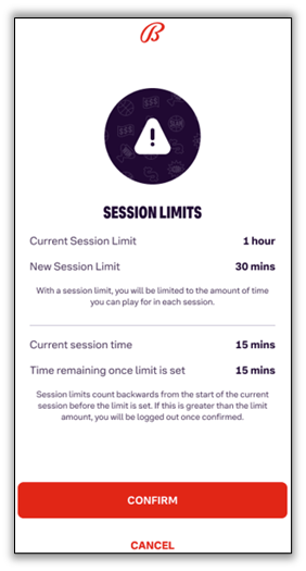 When you choose your desired Session Limit, you will be prompted to review and confirm your selection, which will be activated immediately upon clicking 'Confirm.' The limit takes effect as soon as you log in. For example, if you've already been logged in for 30 minutes and set a 1-hour session limit, you will have only 30 minutes left to play until the limit resets.